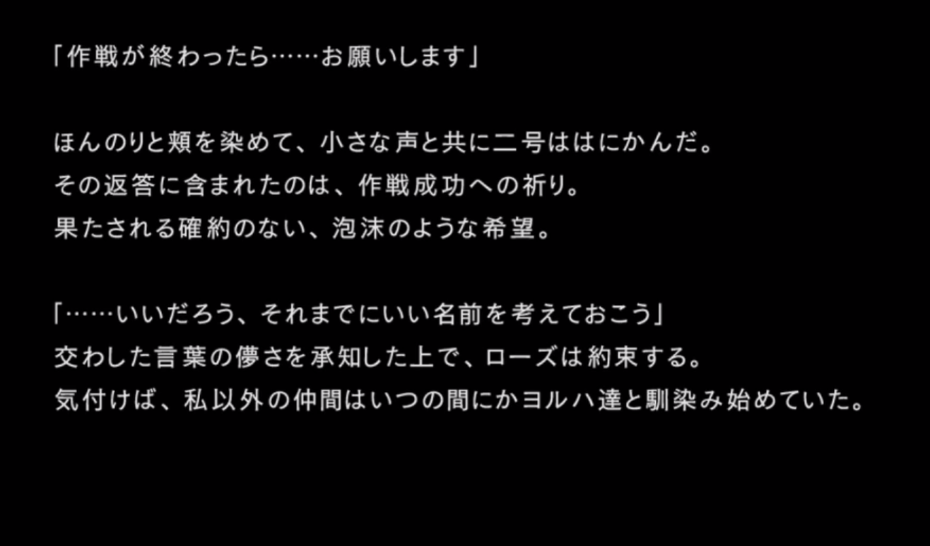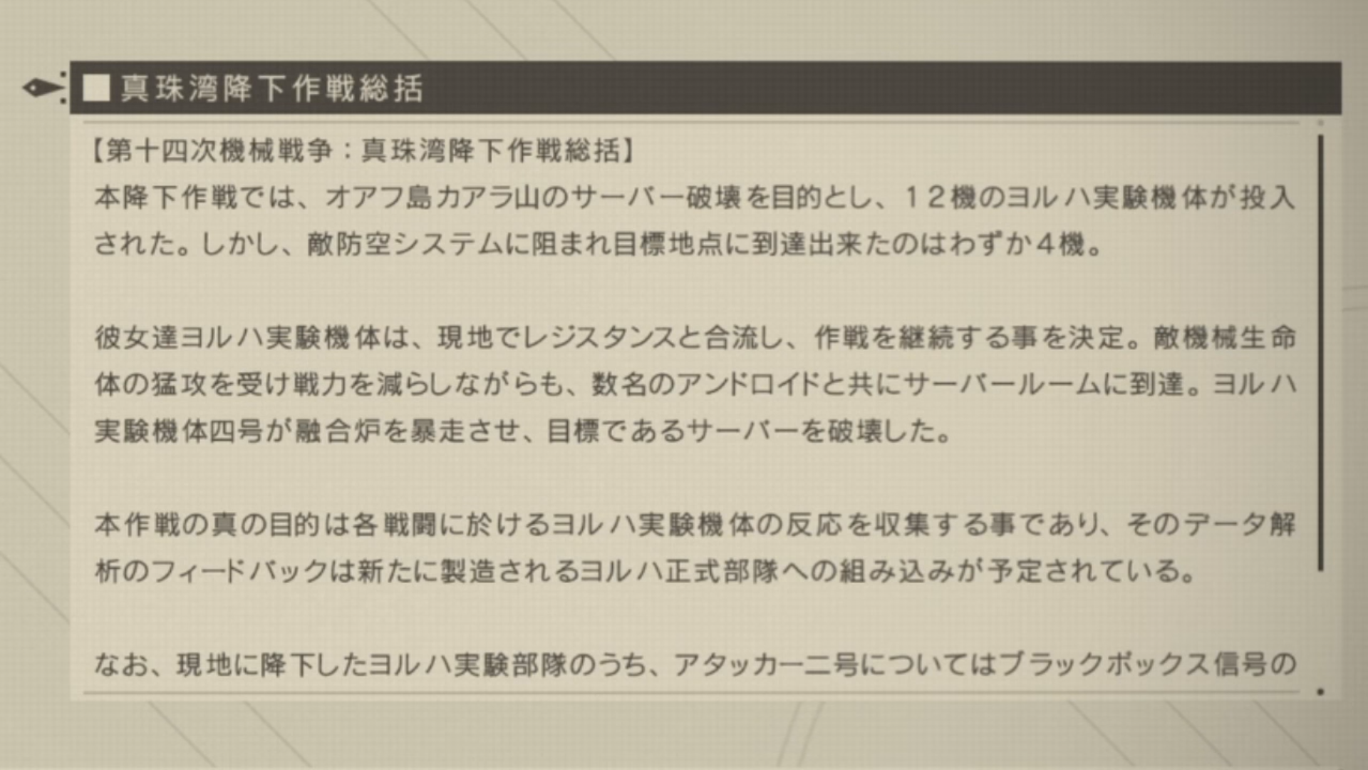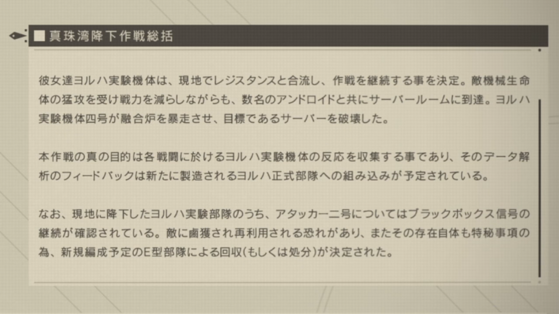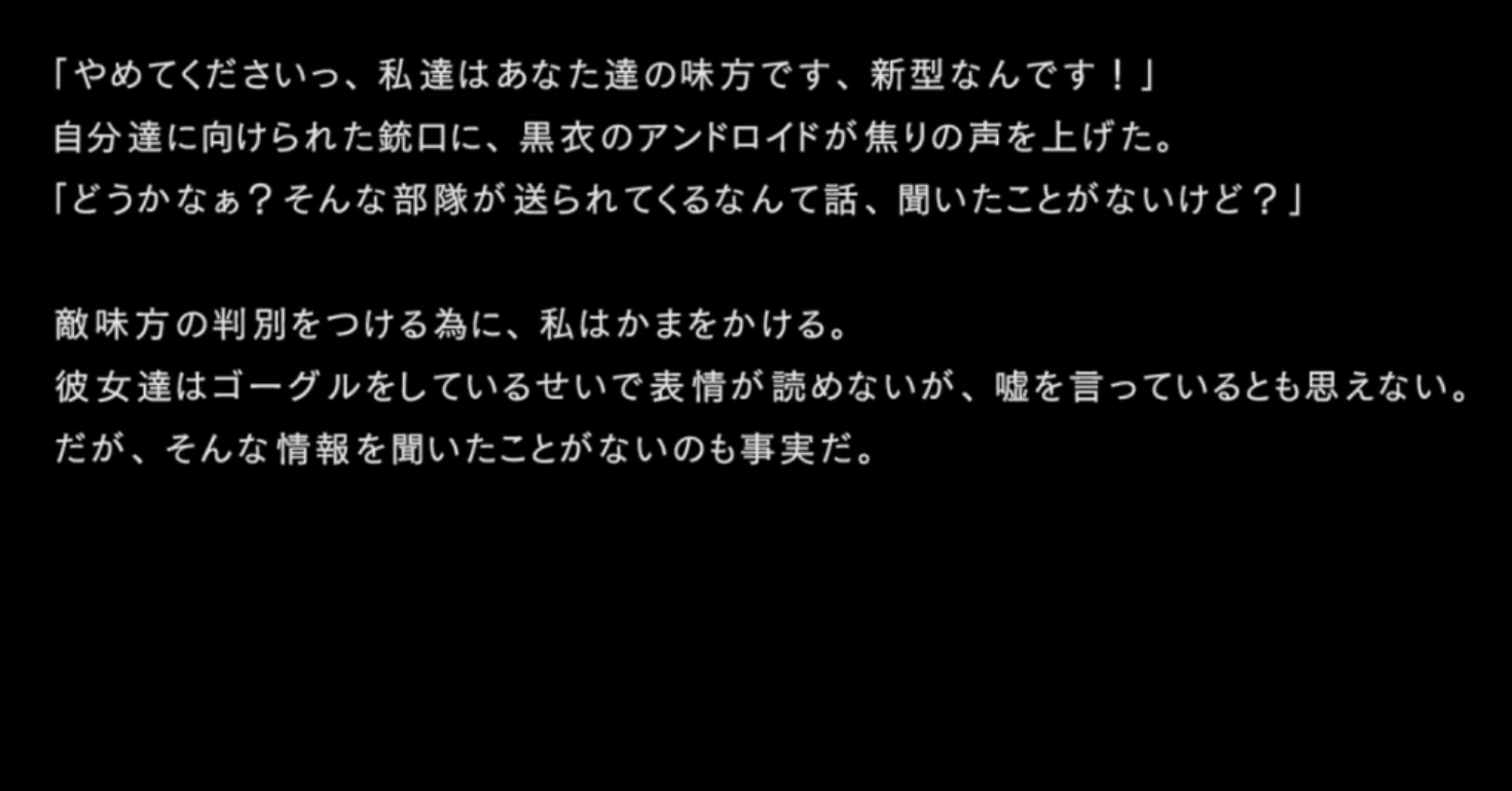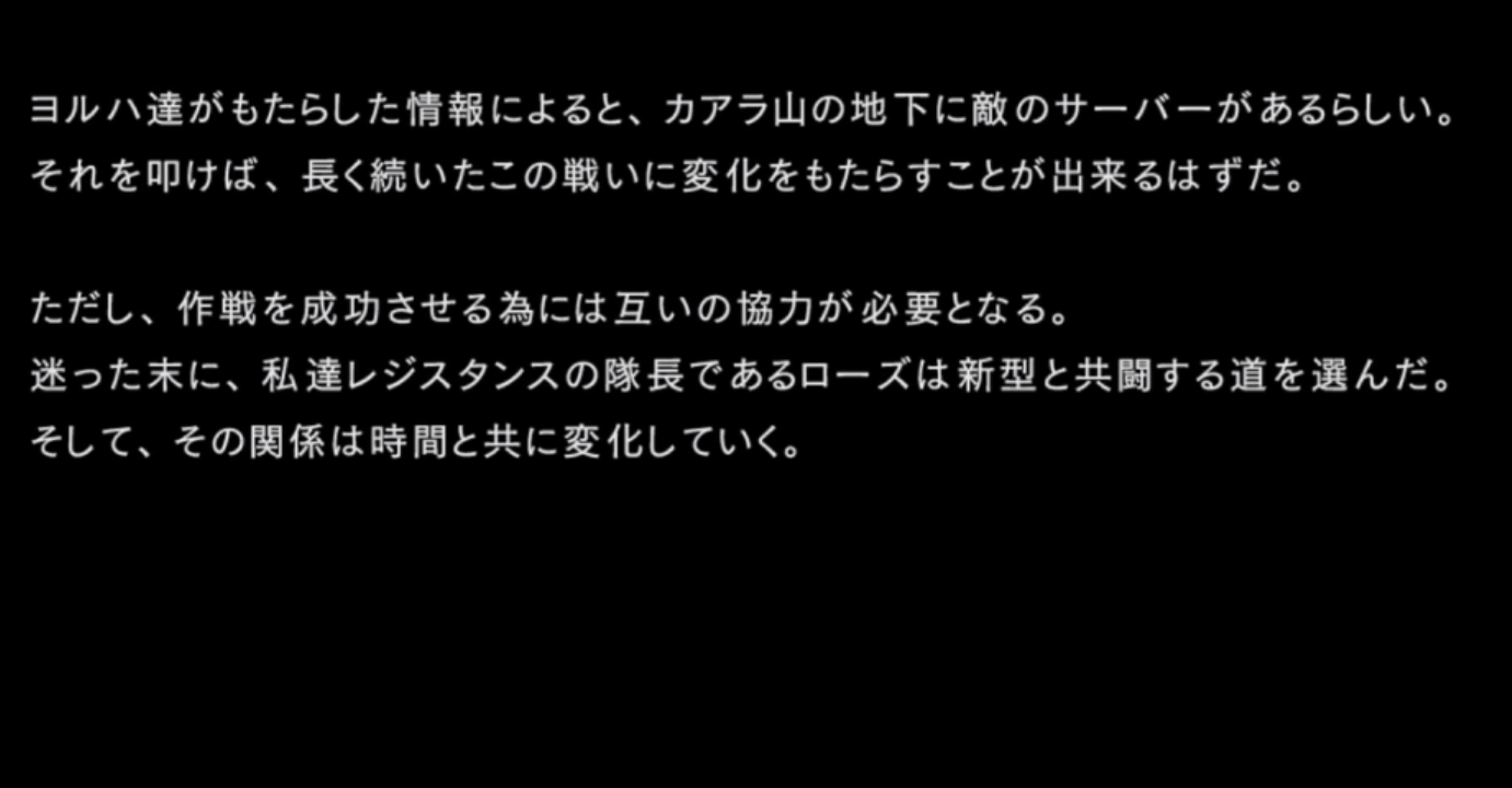 「本作戦の真の目的は各戦闘におけるヨルハ実験機体の反応を収集することであり・・・」