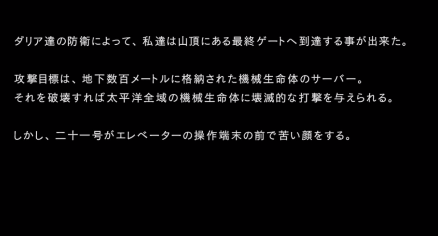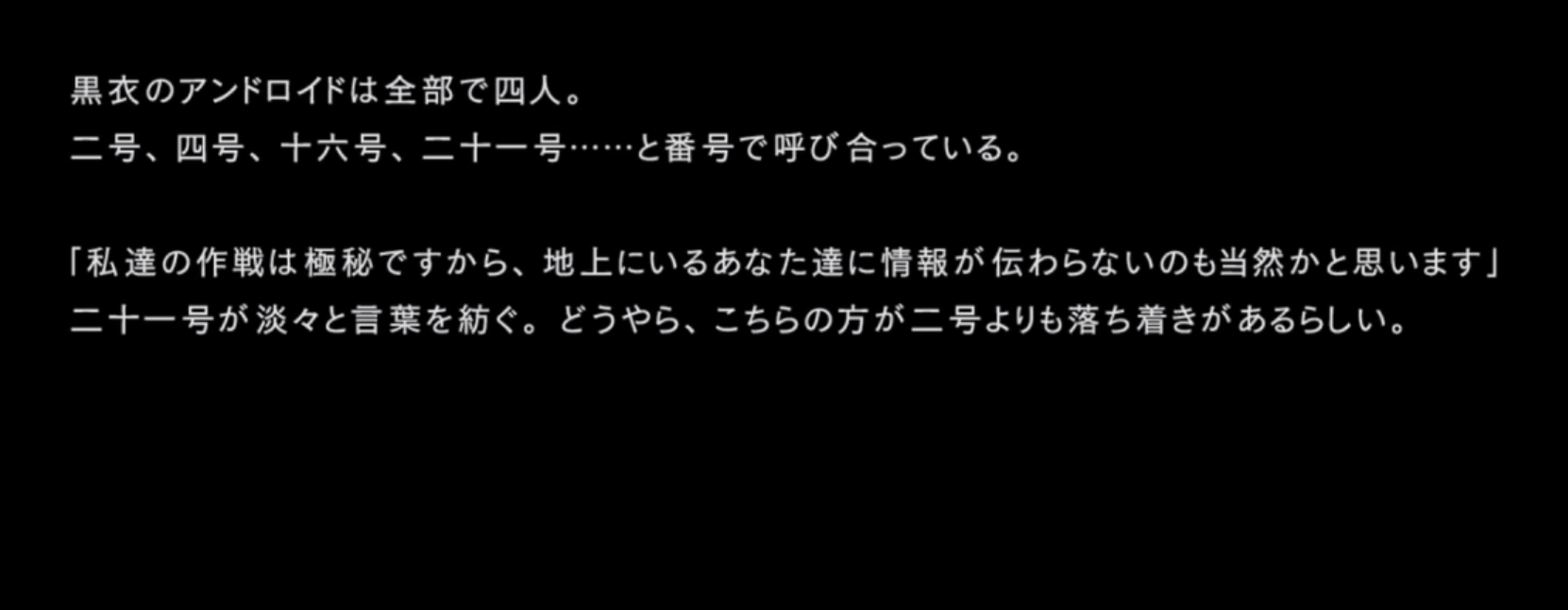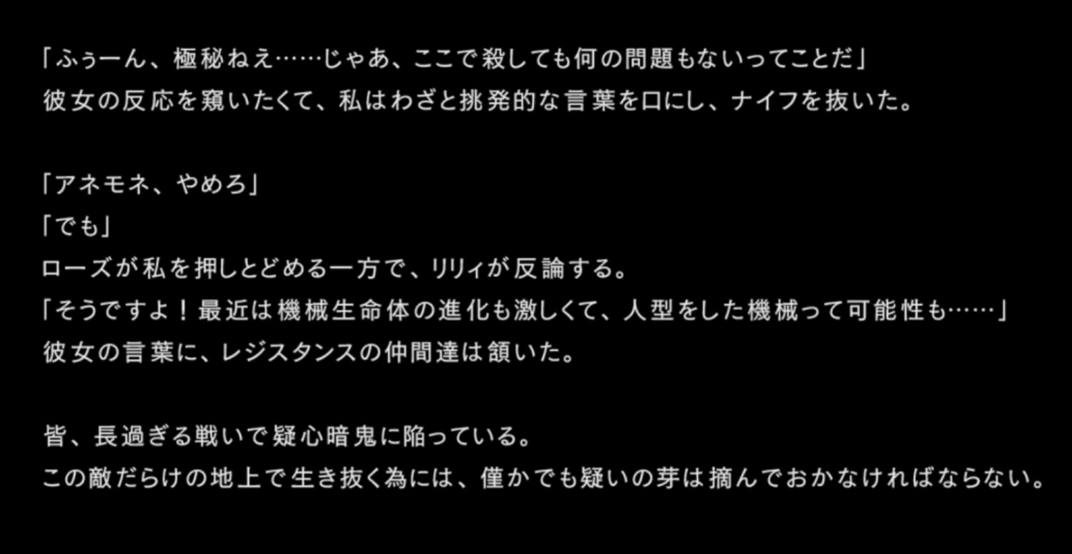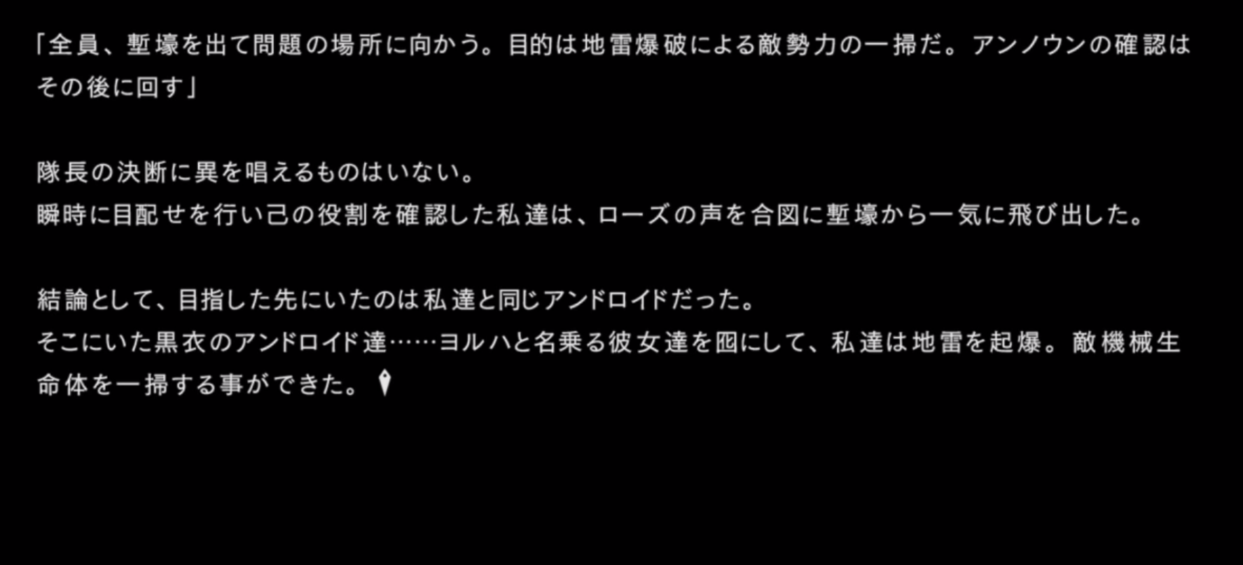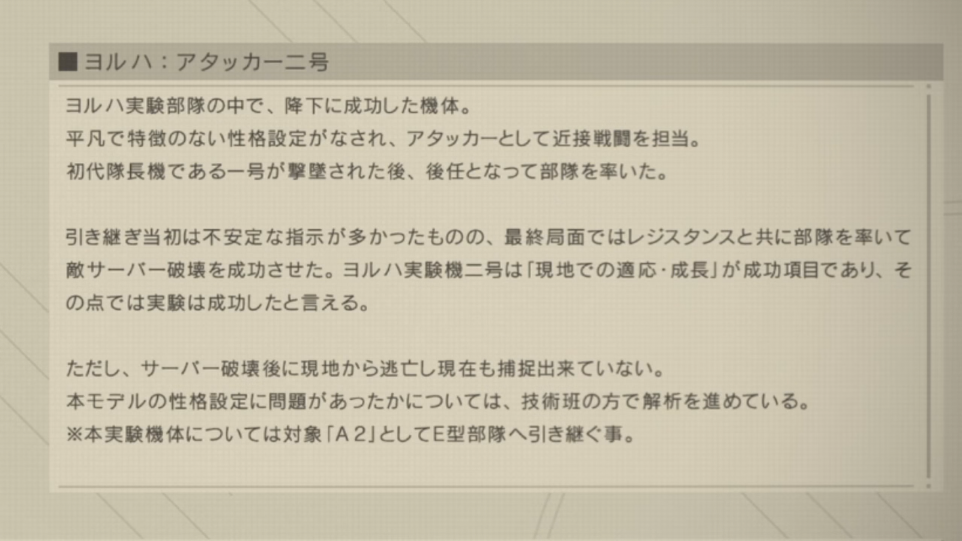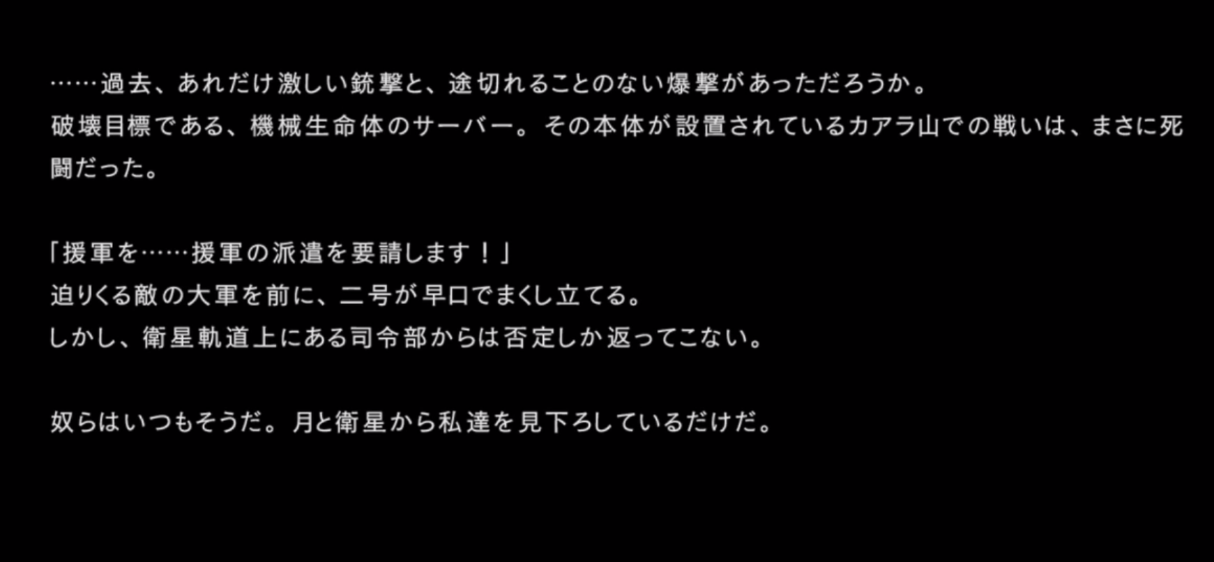 「本作戦の真の目的は各戦闘におけるヨルハ実験機体の反応を収集することであり・・・」