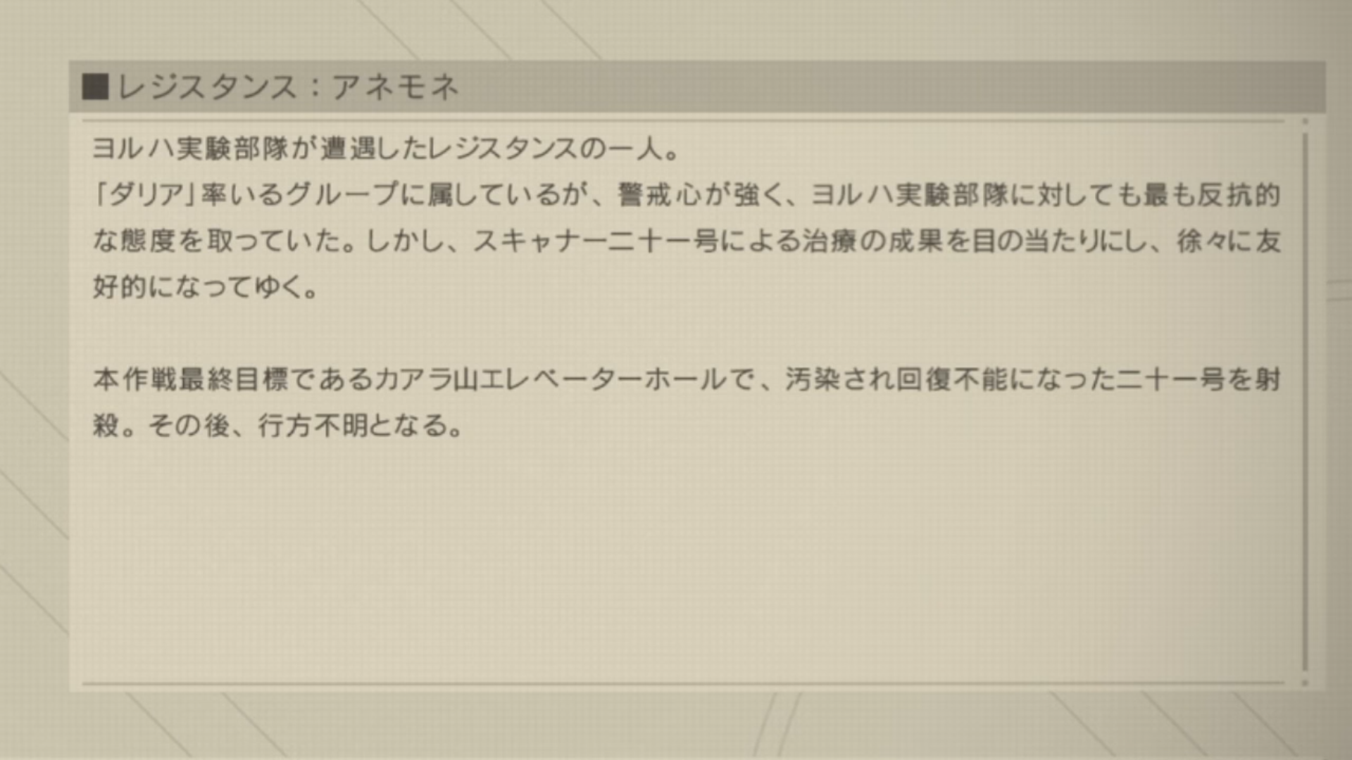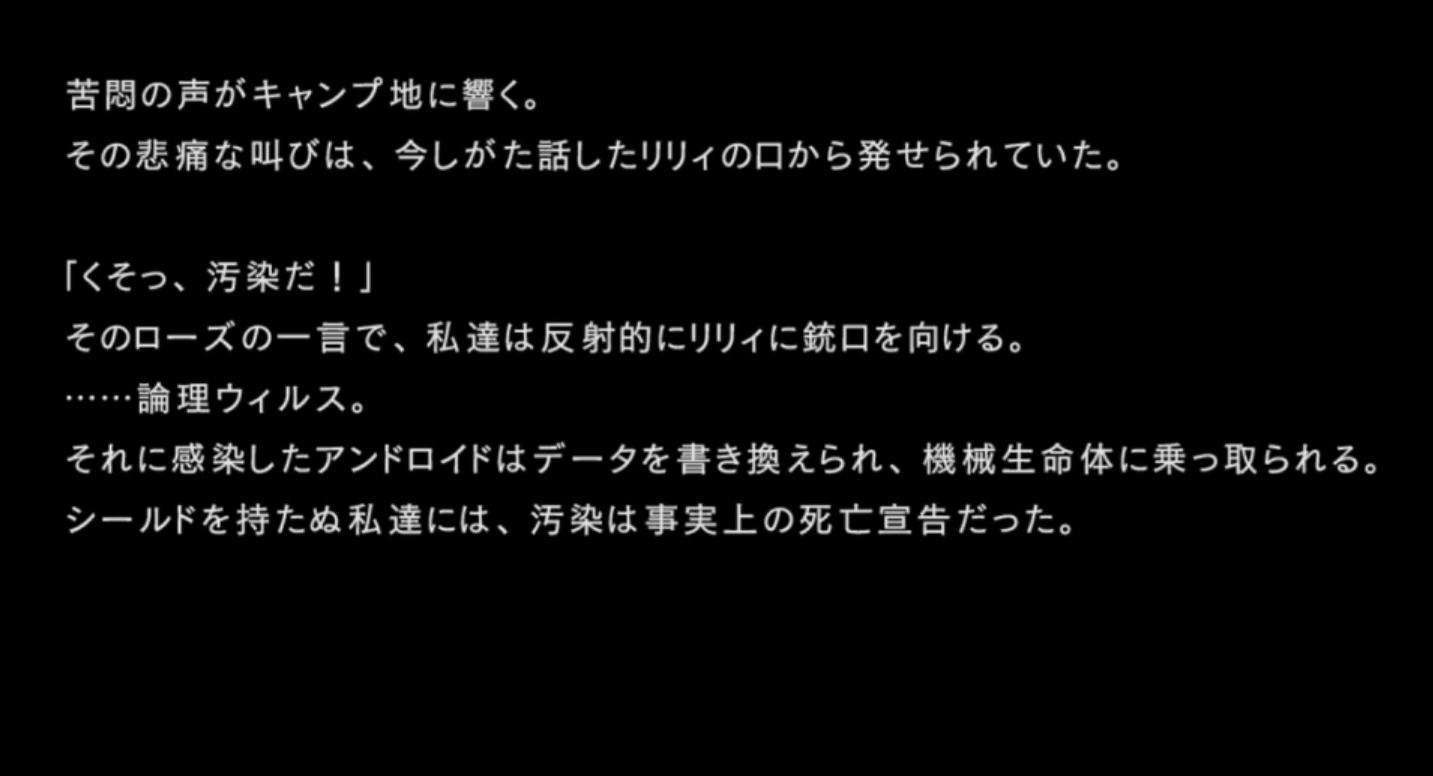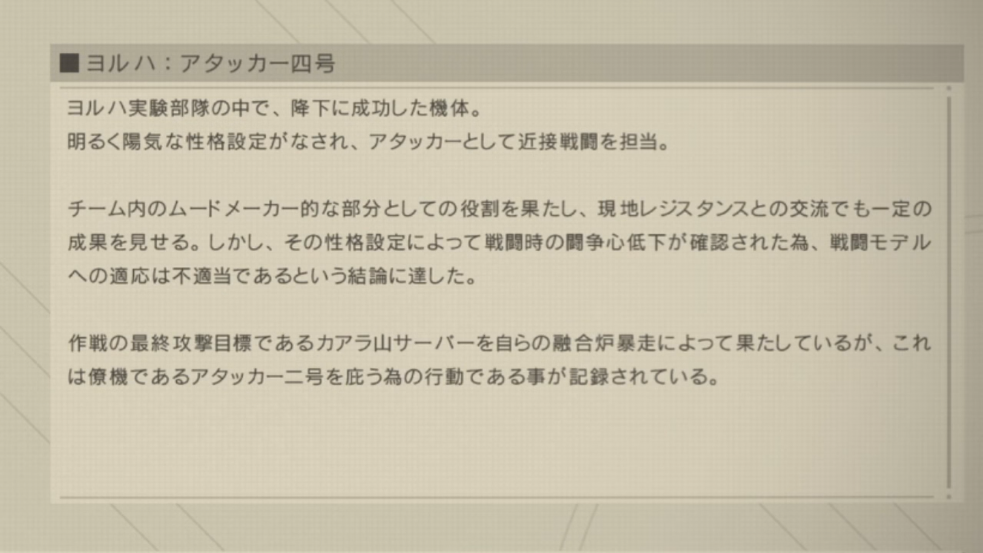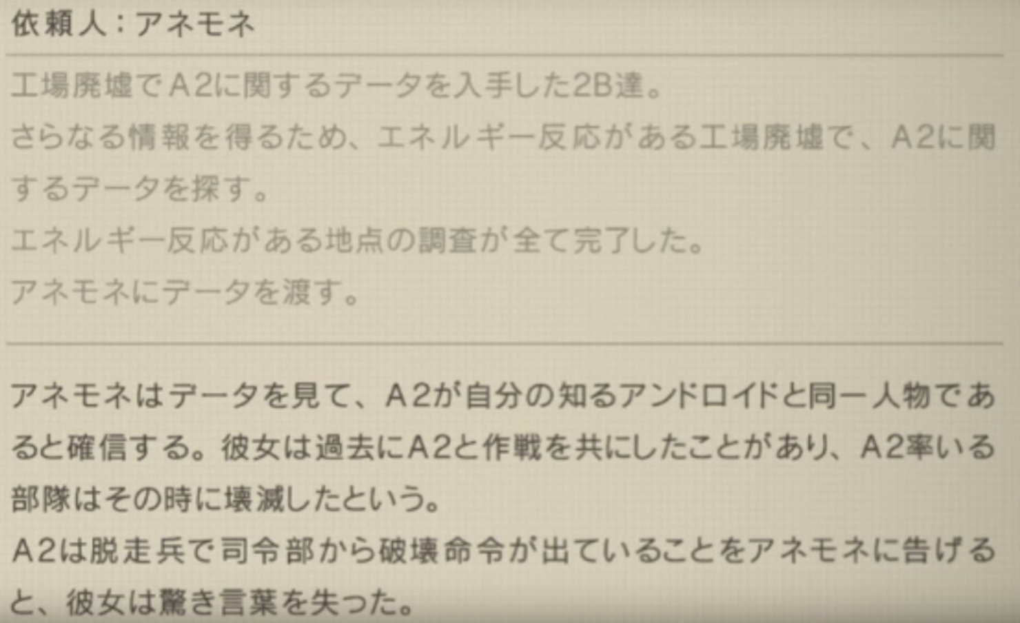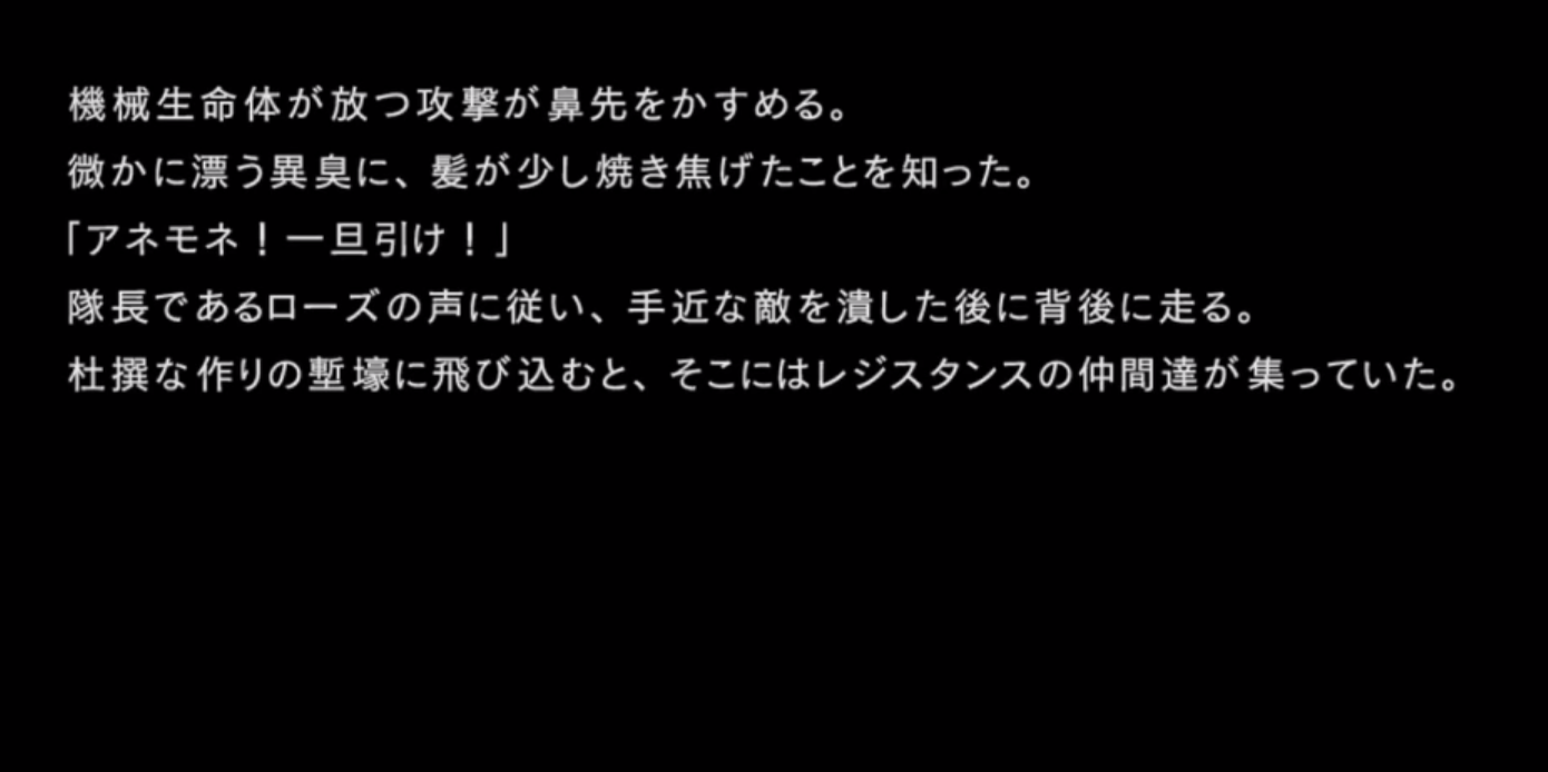 「本作戦の真の目的は各戦闘におけるヨルハ実験機体の反応を収集することであり・・・」
