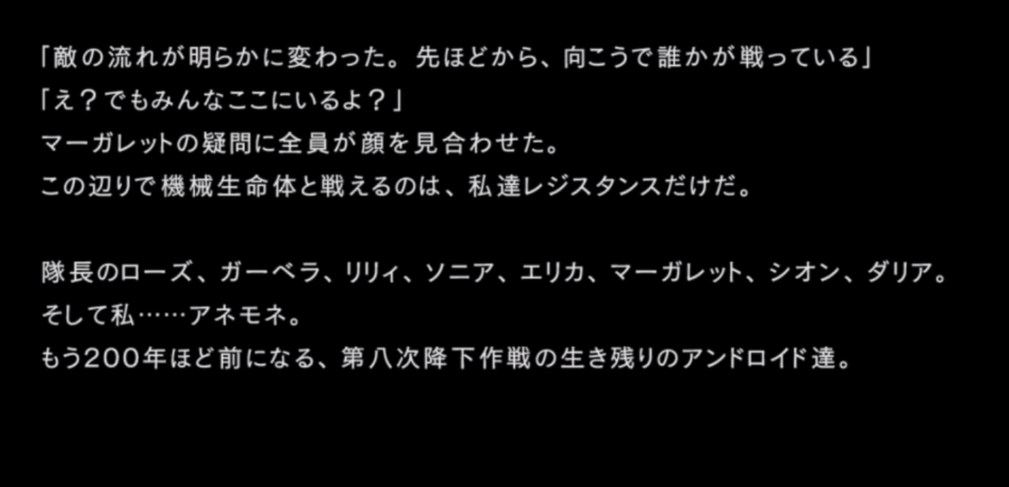 アネモネたちと、A2たち実験型ヨルハが初めて出会ったのは、戦場。