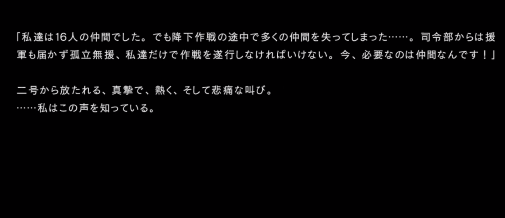 「待ってください!私たちは16人の仲間でした。でも、降下作戦中に多くの仲間を失ってしまった・・・。司令部からは援軍もなく孤立無援。今、必要なのは仲間なんです!」