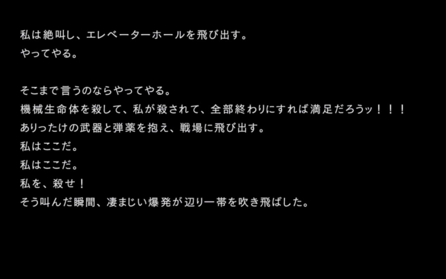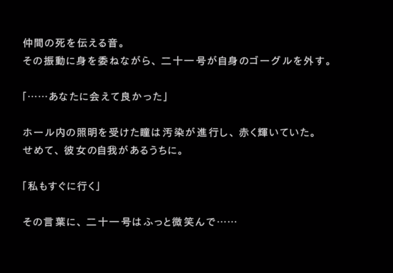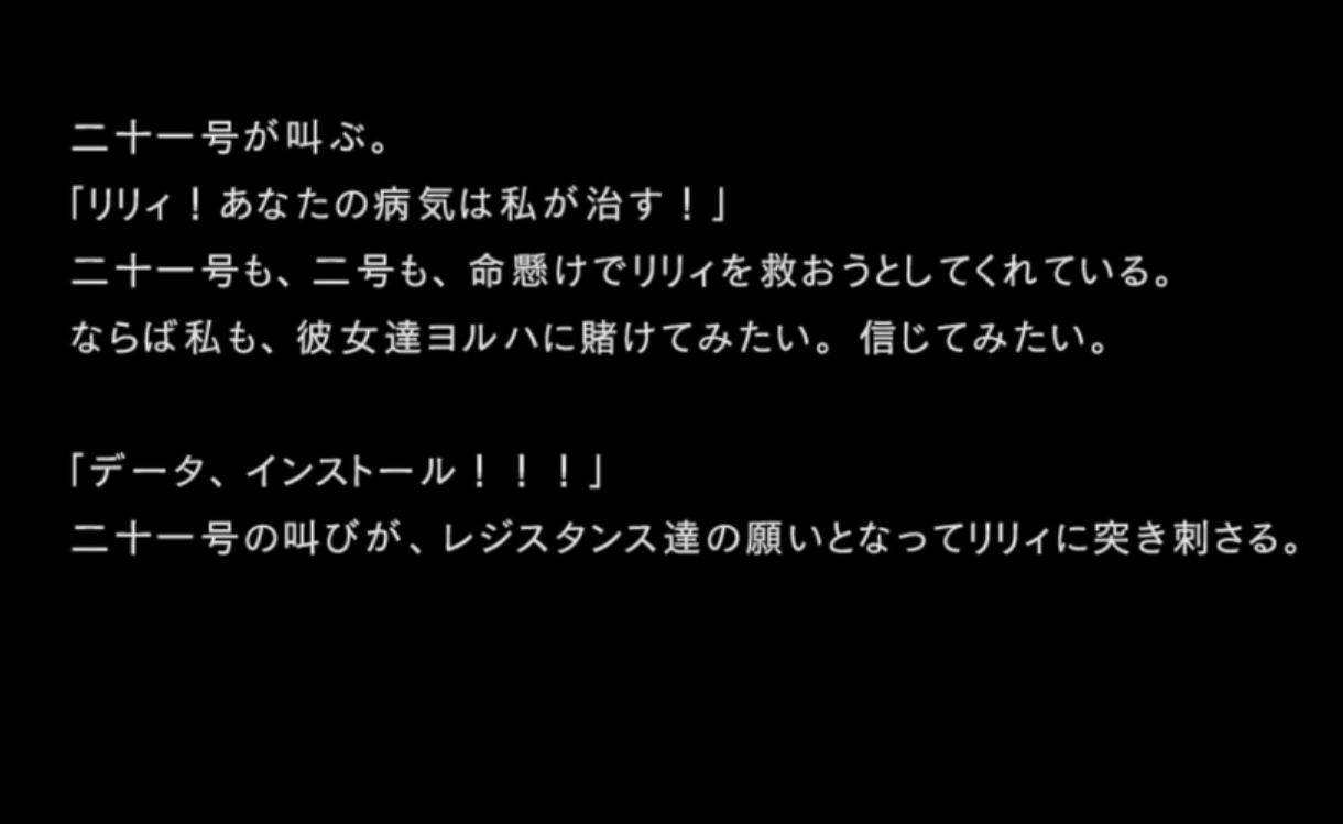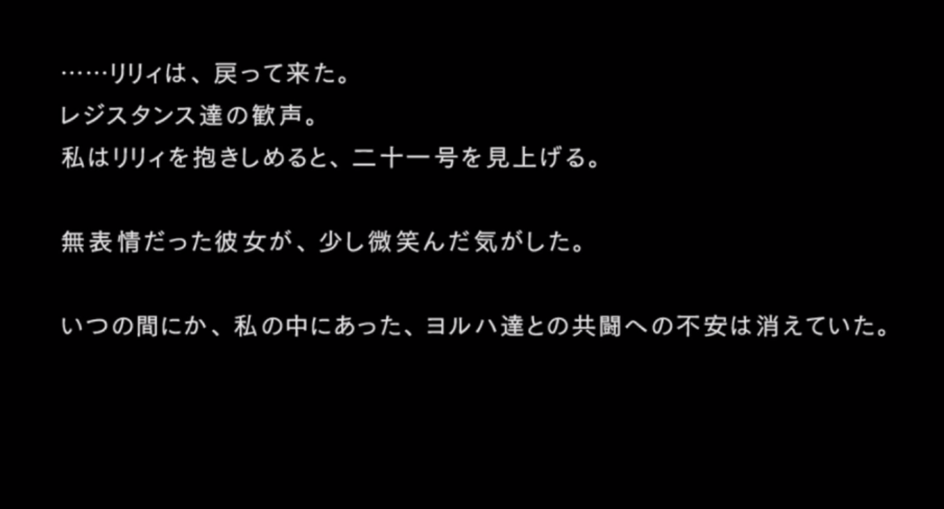 そして、「いつの間にか、私の中にあった、ヨルハ達との共闘への不安は消えていた」と、