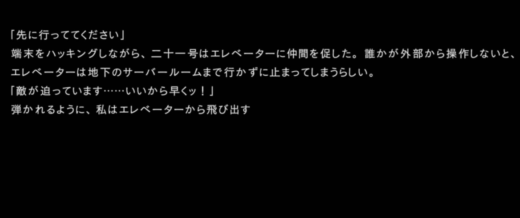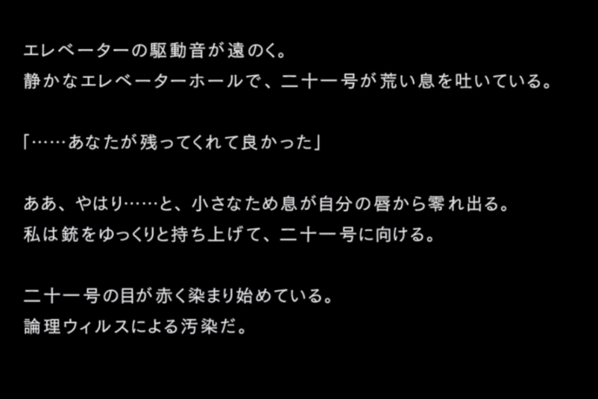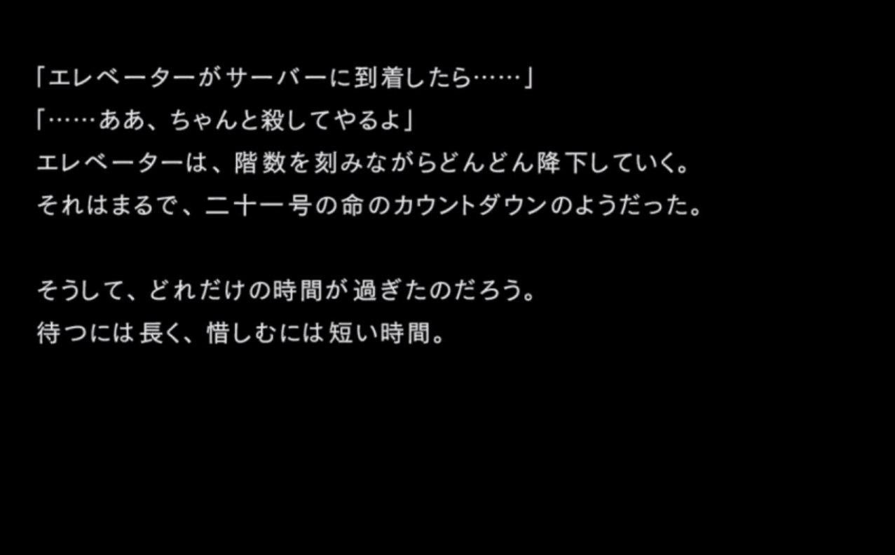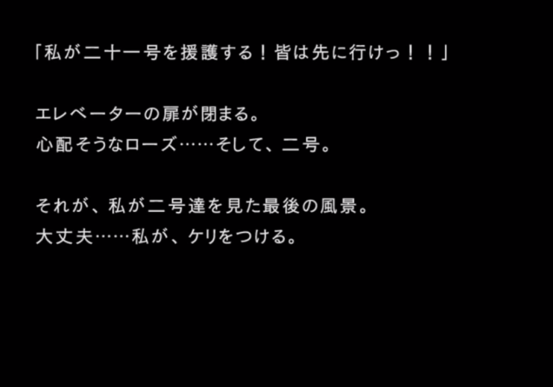 サーバールームに向かう中、エレベーターホールでエレベーターを操作することになった二十一号と彼女を援護するアネモネ。