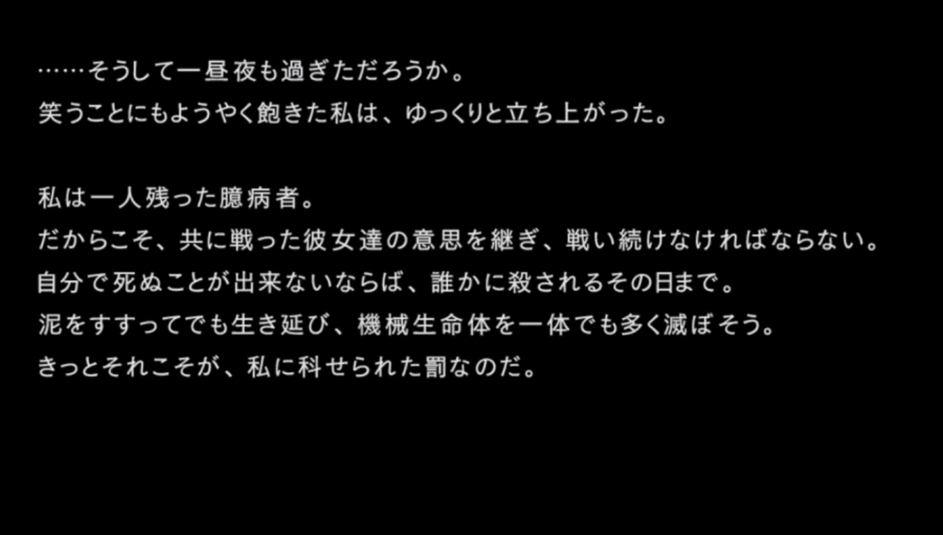 「泥をすすってでも生き延び、機械生命体を一体でも多く滅ぼそう。きっとそれこそが、私に課せられた罰なのだ」