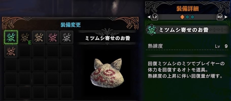 最初から装備しているオトモ道具がこちらのミツムシ寄せのお香ですよね。設置した場所におかれていつでも好きな時に使える優れものです。