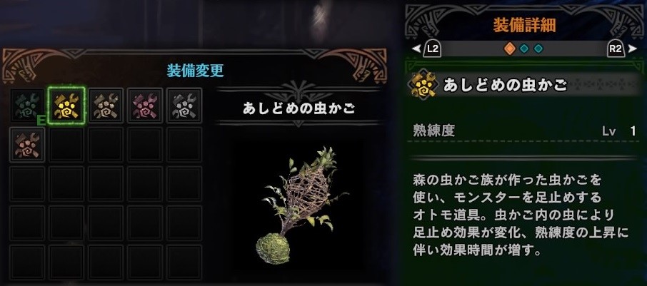オトモの足元にこの虫かごが設置され、近づいて〇か攻撃すると、モンスターがめまいを起こしたり、マヒして動きが止まります。なかなかうれしいです。(#^^#)
