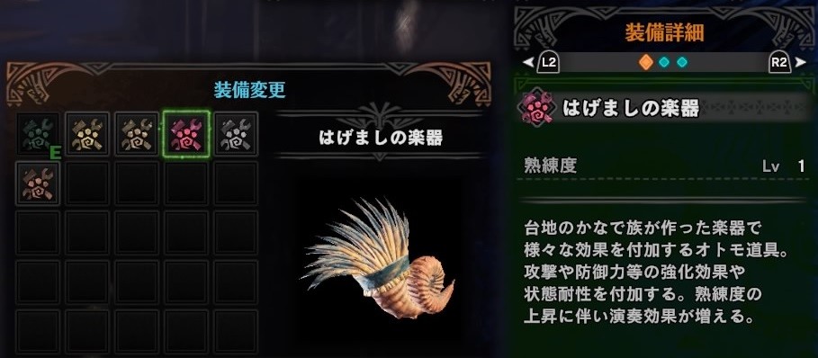 はげましの楽器は、オトモ用の狩猟笛のようなもので、ハンターやオトモのサポート(ステータスアップ)効果を持っています。