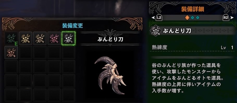 ぶんどり刀は、モンスターから素材を盗む、という以前ご紹介した追い剥ぎ装衣にもちょっと似たオトモ道具です。