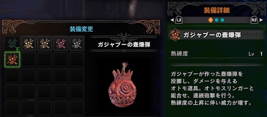 ガジャブーが作った壺爆弾を投擲し、ダメージを与えるオトモ道具です。