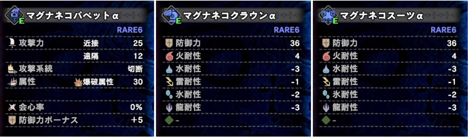 こちらは、カガチネコシリーズ。トビカガチから作れますので、序盤はずっとこのオトモ装備でした♪
