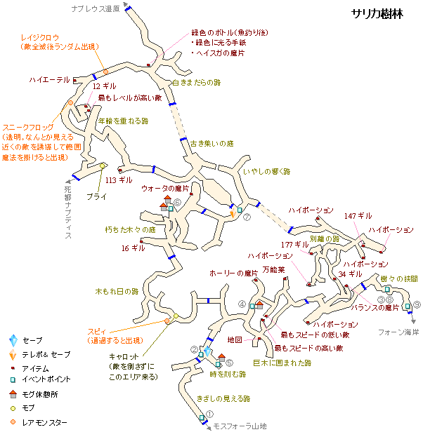 | 4 | この位置付近にトラップがあり、その付近にトレジャーがあります。 この付近の風化した岩を調べると灰白のひさしに行く道ができます。 水音の伝わる処の北にある「灰白のひさし」にいるチョコボにギサールの野菜をあげると乗せてくれます。 水音の伝わる処で「モスフォーラ山地の地図」や新しい武具を売っています。 ゲートクリスタルもあります。 岩坂のそびえる路→北の山すそ→やませおろす橋→サリカ樹林へ | ハイポーション、37ギル、パイレットギア |