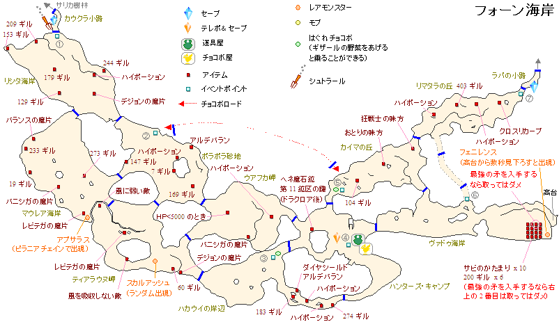 | 2 | チョコボに乗っていれば、ここからチョコボロードでショートカットできます。 | 147ギル、ハイポーション、7ギル、アルデバラン、169ギル、風に弱い敵、レビテガの魔片、風を吸収しない敵、60ギル、デジョンの魔片、HP<5000のとき、バニシガの魔片、ハイポーション |