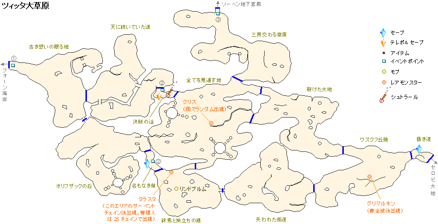 | 4 | ここから先は長いので、装備や道具を整えて行きましょう。 カイマの丘→リマタラの丘→ラバの小路→ツィッタ大草原へ向かいます。 | ヘネ魔石鉱 第11鉱区の鍵(ドラクロア後) |
