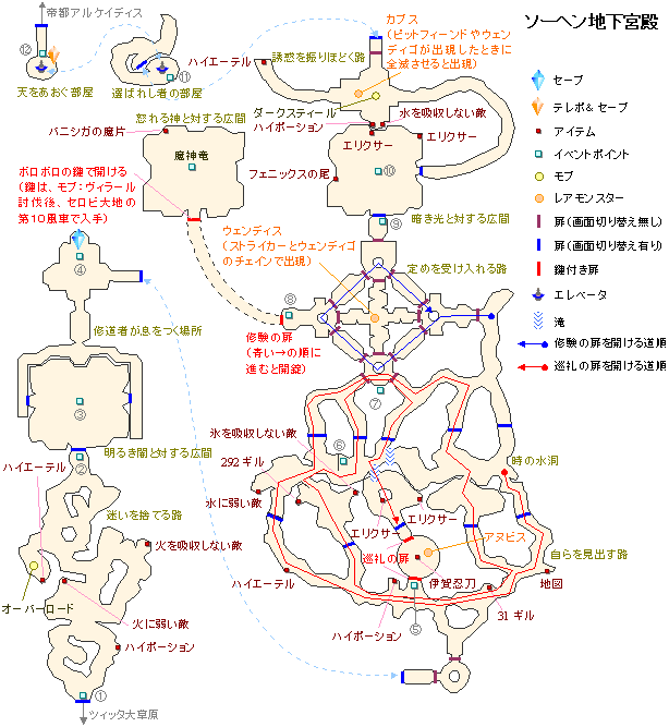 古き想いの眠る地→天に続いていた道→決断の途→全てを見通す地→三角交わる草原→ソーヘン地下宮殿へ。