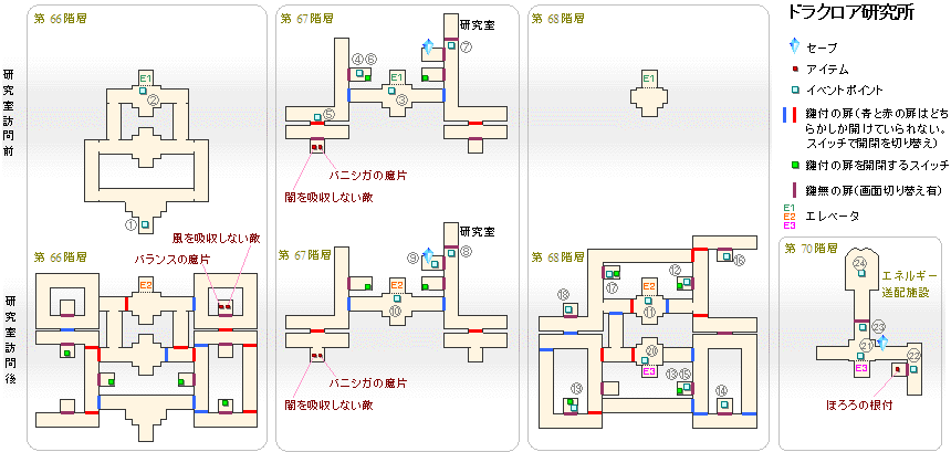 | 2 | 第66階層北のエレベーターで第67階層へ。北東突き当りの研究所でカードと地図を入手。 | |