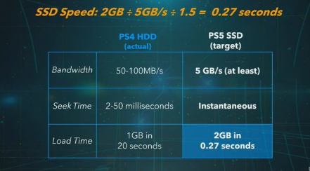シークタイムの削減等も含めた転送速度は、PS4のHDD比で100倍以上。メモリ効率も改善しているとのことです。