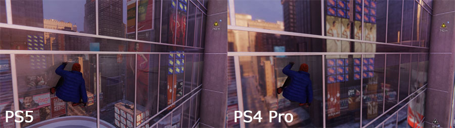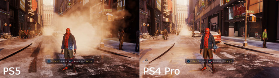 実際にスパイダーマンマイルズモラレスをプレイしていますが、正直、「うぉーすごすぎるっ」という感じはあまりないです。PS4PROでも全然キレイ。