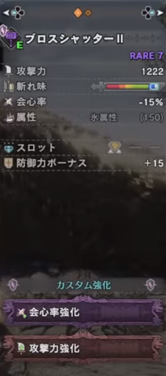これにカスタム強化で会心率強化と攻撃強化をつけ、さらに無撃珠をつけて無属性強化をつけています。