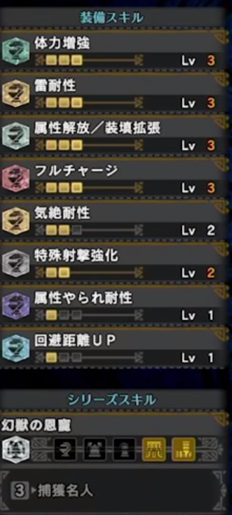 雷耐性レベル3に、フルチャージ、気絶耐性、回避距離アップをつけた、絶対安全重視装備。