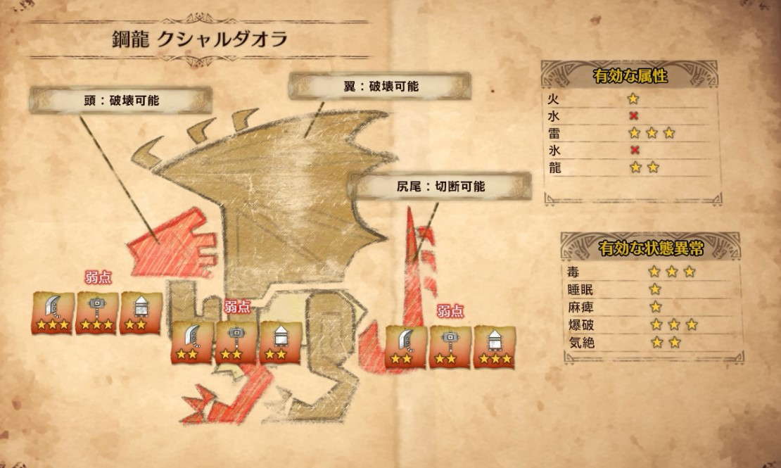 以下、クシャルダオラの弱点や肉質などを復習してみます。