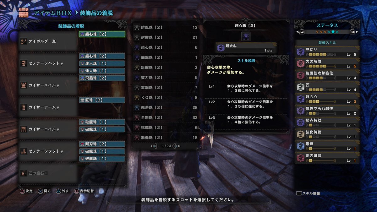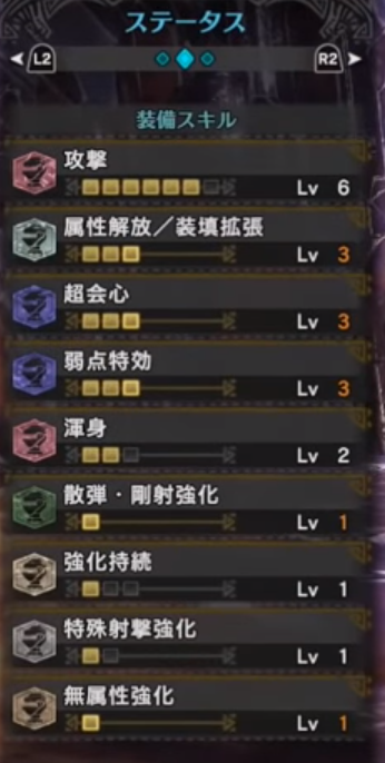 この辺を見ると超会心以外のスキルは以前も何度かご紹介してきた散弾装備とほとんど一緒ですね。