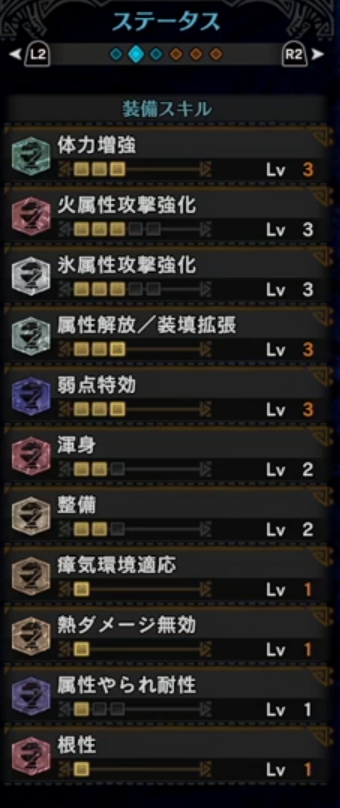 そのほかは歴戦王ゼノジーヴァ弱点の火炎弾を火属性攻撃強化でアップさせます。
