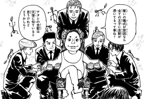 第3者的に宗教を否定的に見ると、信者コミュニティーはこういうかなり親密でだからこそ逃げられない(どんどんはまり込む)というものがあるので、冨樫先生がそれを意識しているとしたら、かなり怖い場面なのですが、