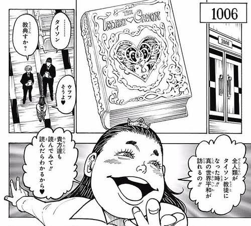 タイソンの念獣の能力はまったく攻撃能力がなく、単純に「教典を読めば読むほど幸せになる(信者になっていく)」ですが、