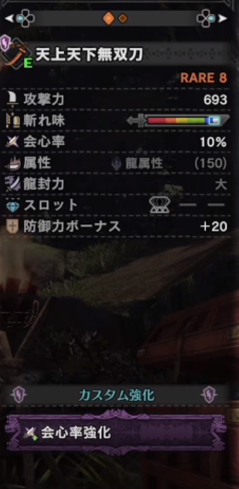 まず、天上天下無双刀には、カスタム強化で会心率強化をつけておきます。