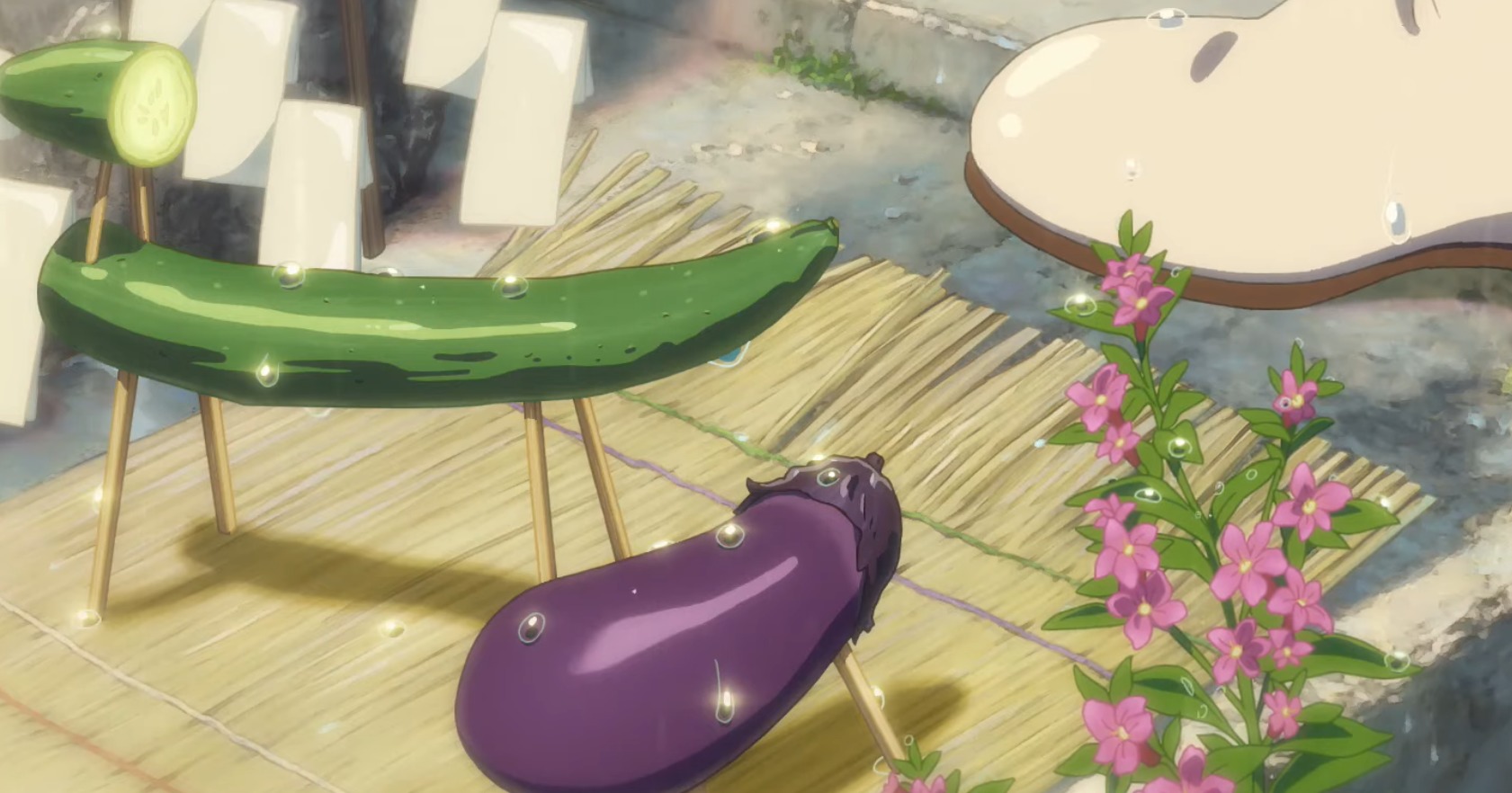 神社に入るときのこのお盆のお供えもののナスときゅうりのきれいなこと!