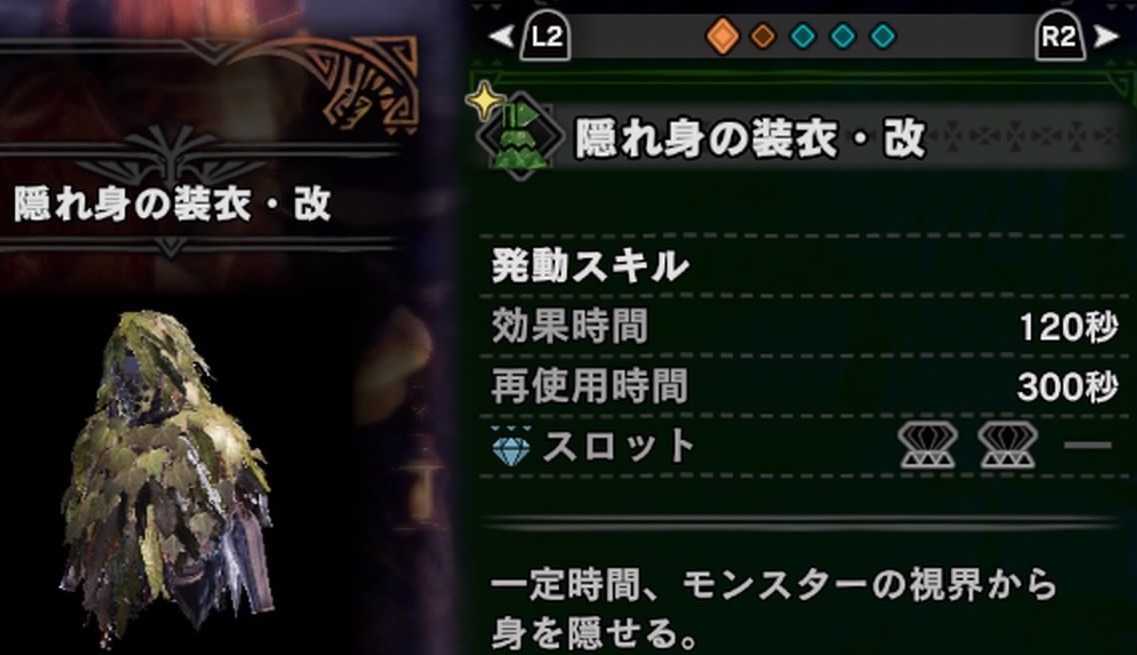 一定時間モンスターの視界から身を隠せる。攻撃を行うかダメージを受けると効果が終了する。