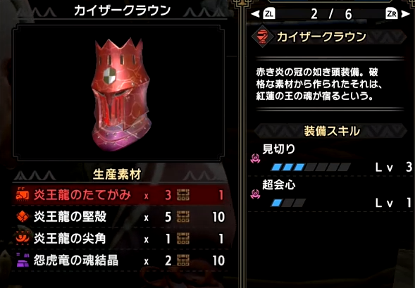 見切りに超会心ついてる頭防具です。この防具のおかげでまた最強装備がいろいろ変わりましたね。