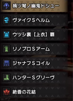 頭だけレウスs、あとはナルガ装備で超簡単に作れる回避装備です。