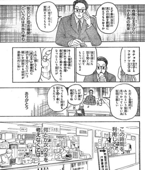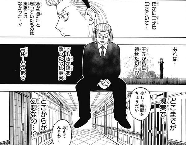 わざわざ第5王子の部屋の扉の前まで行って、自害。その後、念能力の検証をさせるつもりの様子。(ここが個人的に謎でした。自分の部屋でシカクをやるとまずいから、わざわざ第5王子の部屋の前で証人を作ったのか、他に調べさせるためなのか・・・?)